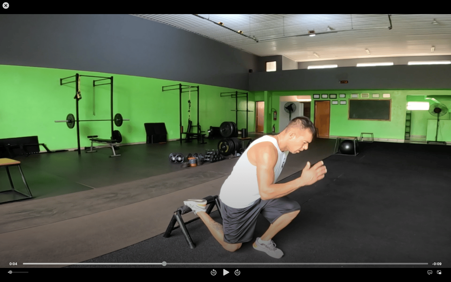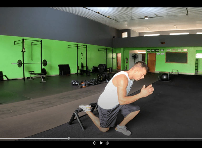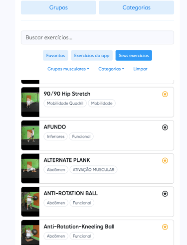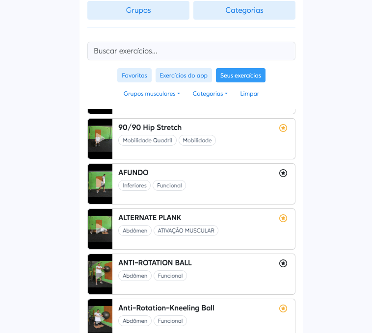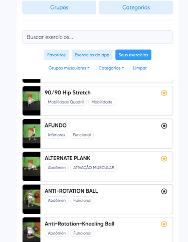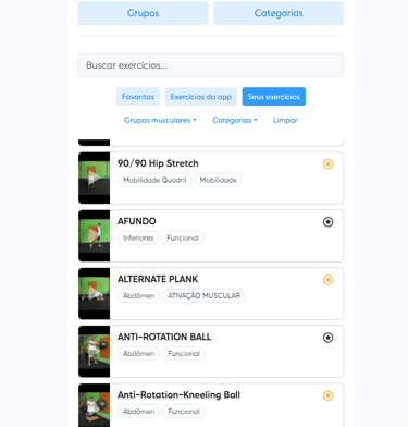 Os treinos são em formato de video, com sequência de exercícios contendo séries e número de repetições, com exemplos de movimento a ser executado.